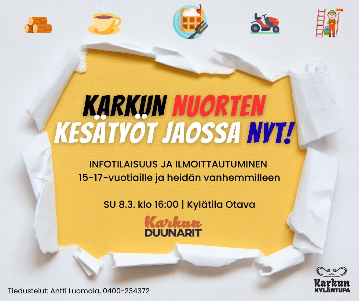 Karkkulainen 15-17-vuotias nuori sekä nuoren vanhempi/vanhemmat, tervetuloa infotilaisuuteen kesätyömahdollisuuksista Karkussa! Infotilaisuus pidetään sunnuntaina 8.3. klo 16.00 kylätila Otavassa. Ei ennakkoilmoittautumista. Lisätietoja Antti Luomala, puh. 0400-234372